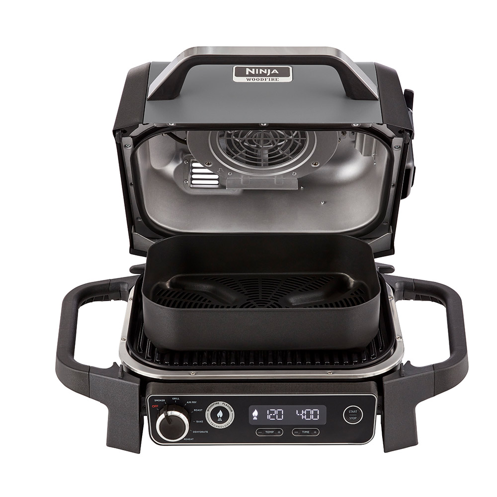 La nuova tecnologia Ninja Woodfire è un barbecue elettrico portatile che griglia, affumica e frigge ad aria le tue carni preferite.